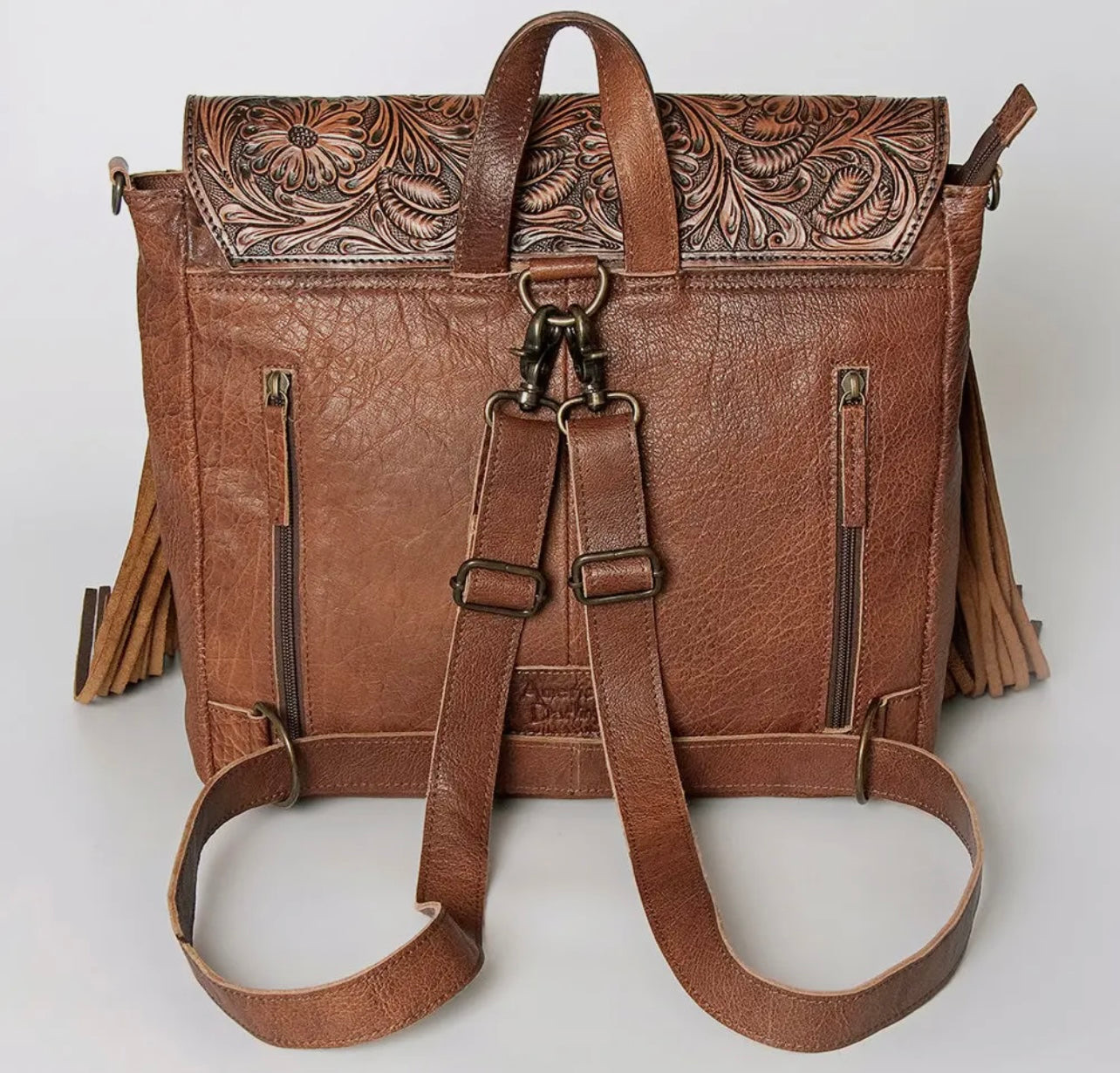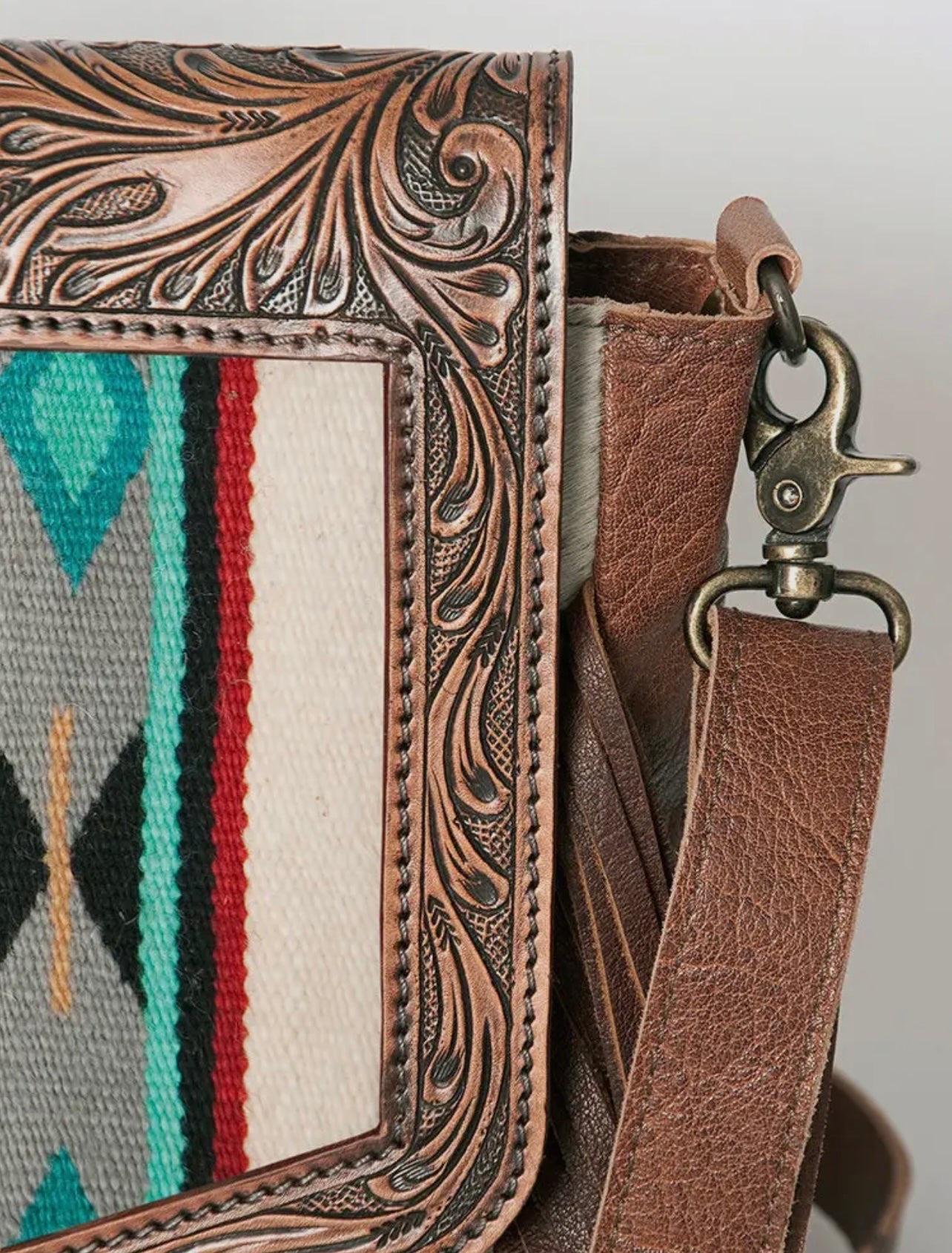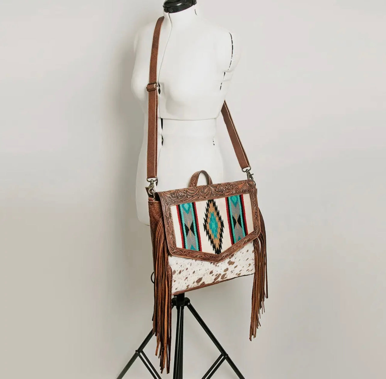 Crafted from eco-conscious, full-grain American cowhide with rich hair-on-hide panels, the bag balances rustic charm with modern utility. Long leather fringe accents and antique hardware add dramatic flair, while a wide strap ensures all-day comfort.