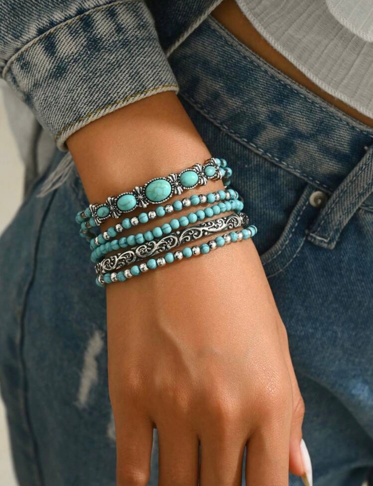 Product Description Set of five beautiful boho turquoise bracelets 2.16 inches across and has stretch Other Details badge: widget: charliebraeboutique Add to Cart Boho Heart Necklace MSRP: Was: Now: $20.00 The boho heart necklace is stunning and the perfect summer accessory! Chain clasp adjustable length … charliebraeboutique Add to Cart Western Pearl Necklace Set MSRP: Was: Now: $32.00 Western Soul, Boho Spirit Add the perfect western flair with this 4-piece Boho Chic Beaded Necklace … Add to Cart Lola Blossom Necklace Set MSRP: Was: Now: $42.00 Squash Blossom Necklace Set Add to Cart Copper Bow Tie Necklace Set MSRP: Was: Now: $32.00 Navajo Style Pearl Bow Necklace Set × OK