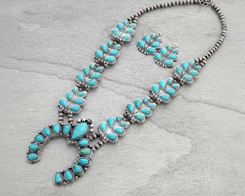 Turn every head in the room with this breathtaking turquoise squash blossom necklace set. Featuring vibrant hand-set turquoise Howlite stones framed beautifully, this bold piece is the ultimate Western statement. The detailed blossom clusters and stunning petal pendants create a timeless look that feels both classic and unforgettable.