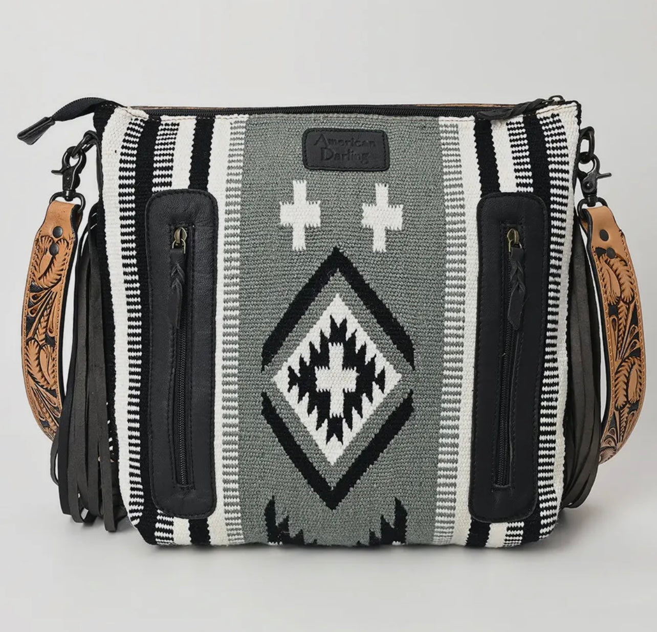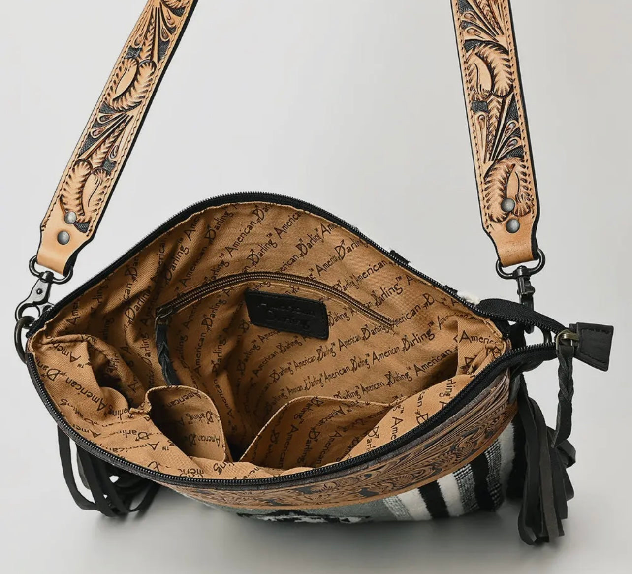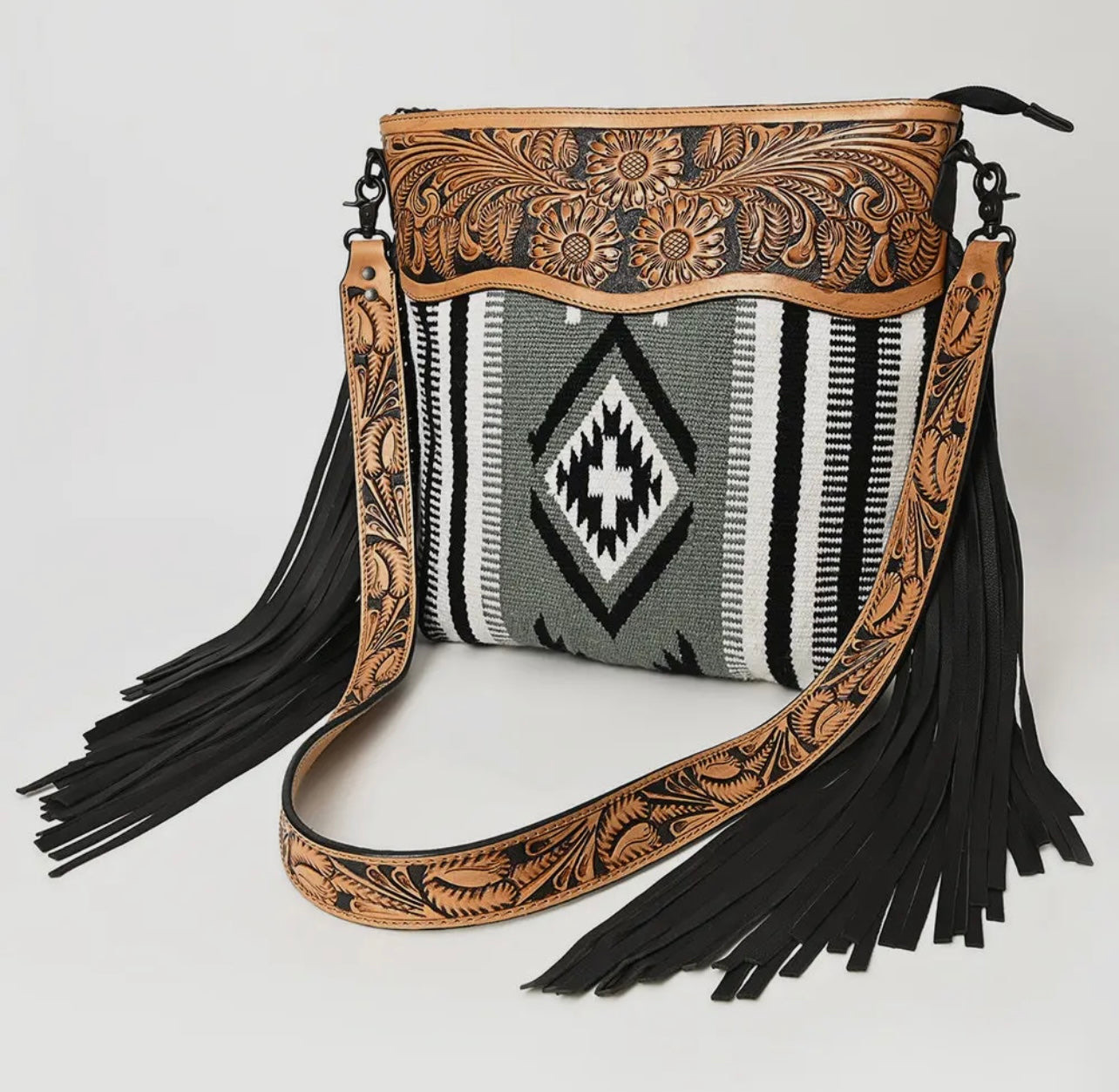 Celebrate true Western heritage with this stunning hand-tooled leather crossbody bag. Featuring a vibrant Aztec-inspired wool panel in warm brown, orange, and white, this piece combines traditional craftsmanship with bold style.