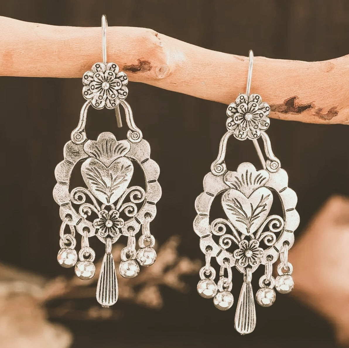The Shakespeare Earrings are truly one of a kind, with their intricate chandelier silhouette, vintage floral detailing, and softly antiqued silver-tone finish. The ornate heart centerpiece draws the eye and adds a romantic, heirloom-inspired touch that feels both dramatic and refined. These earrings are designed to turn heads—whether you're dressing up for a night out or adding vintage charm to your everyday style.